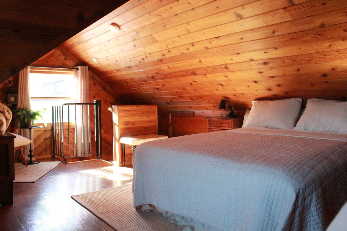 Slappaðu af í þessu einstaka og friðsæla fríi. Ég hlakka til að taka á móti þér. Njóttu sérherbergis með queen-size rúmi og snjall-sjónvarpi með stórum skjá. Fullbúna baðherbergið er hinum megin við ganginn. Vertu með heitan eld á setusvæðinu. Það er vinnusvæði og háborð til að fá sér te/kaffi eða vín með kvöldverði um leið og þú nýtur útsýnisins yfir Hudson í gegnum stóru gluggana og rennihurðina. Við höfum bætt við aðskildri eldhúskrók, aukahæðarpotti og spaneldavél.