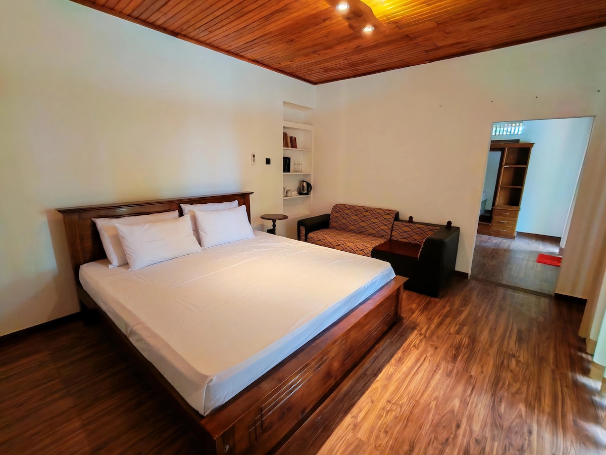 Enjoy a comfortable stay in our private two-room retreat near Unawatuna Beach, ideal for up to 4 guests. Both rooms are air-conditioned and feature dedicated workspaces, fast Wi-Fi, and modern bathrooms. One room offers a high ceiling with a lush green view, while the other includes a cozy living area and a relaxing bathtub. Thoughtfully designed for comfort, privacy, and a peaceful stay close to beaches and local attractions.