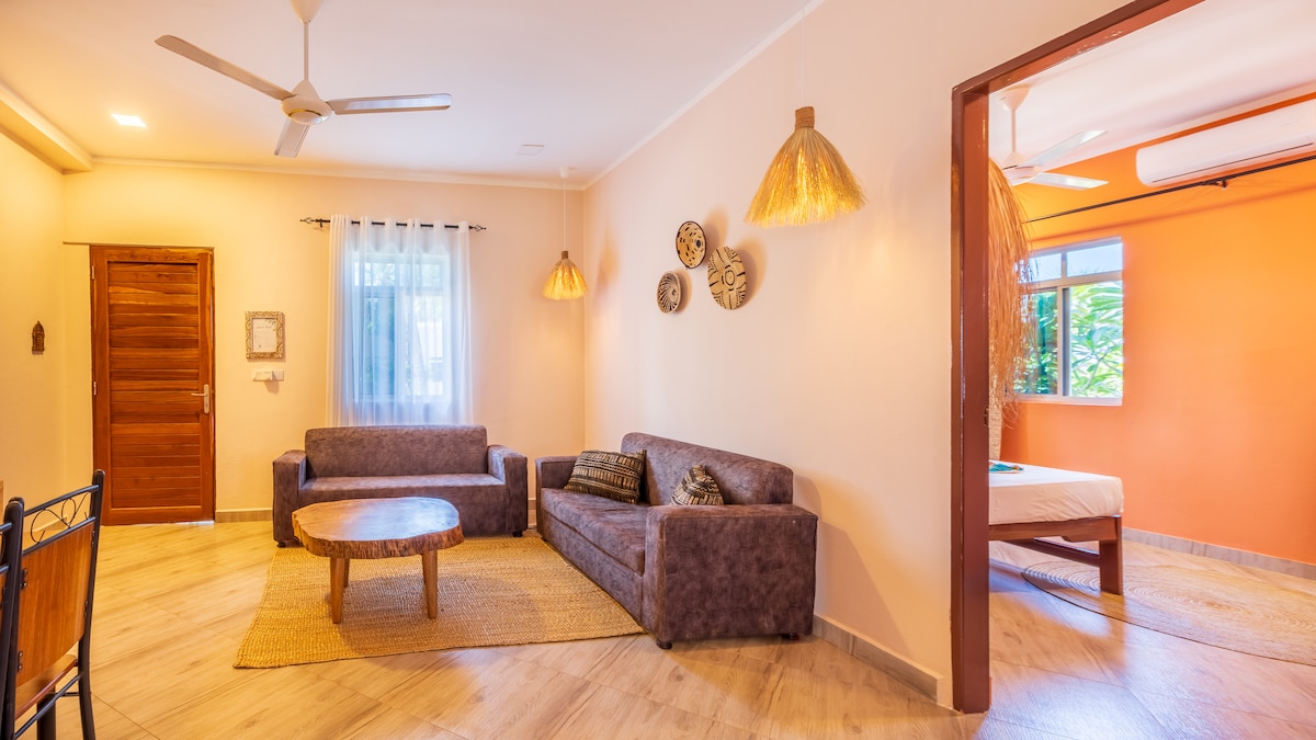 Welcome to Majani Breeze — your peaceful escape in Nungwi, Zanzibar. Set on a gentle slope with views of lush tropical gardens, this Apartment features a private balcony perfect for relaxing and soaking in the beauty around you. We’re just a short walk from the peaceful Sazani Beach for sunrise views, and only five minutes from Nungwi’s white sandy beach, ideal for watching sunsets over crystal-clear waters. This tranquil retreat blends natural beauty with comfort.