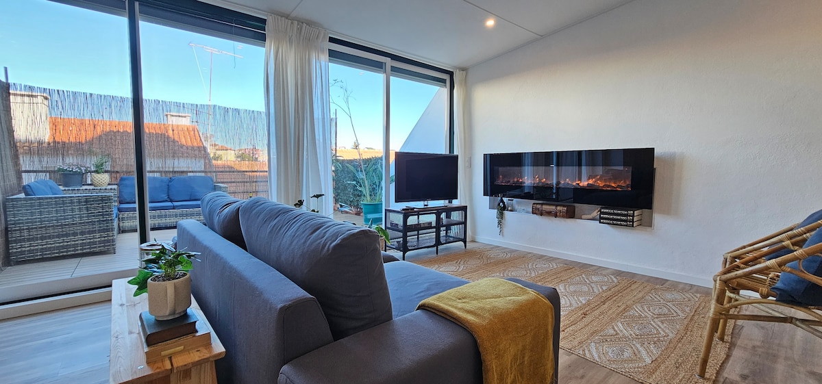 Bjart og rúmgott strandhús í Fonte da Telha, aðeins nokkrum skrefum frá sjónum. Njóttu morgnanna með sjávargolu og morgunverði utandyra á rúmgóðu, einkaveröndinni. Húsið er með tvö svefnherbergi með hjónarúmi, notalega stofu með rennihurðum og fullbúið eldhús. Fullkomið fyrir fjölskyldur eða vini sem elska afslappaða lífsstíl við sjóinn og vilja gista nálægt ströndinni í fallegu Costa da Caparica í Portúgal — nálægt brimbrettastöðum, kaffihúsum og strandveitingastöðum með útsýni yfir hafið og sólarlag.