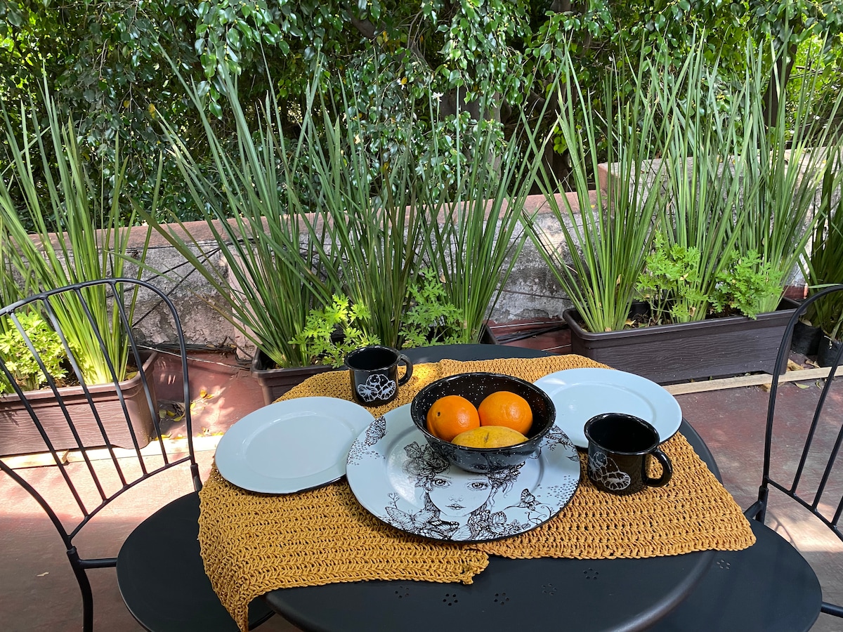 Þetta stúdíó á þakinu er fullkomið fyrir einhleypan ferðamann eða par sem er að leita að einkarými til að vinna að heiman eða til að nota sem heimahöfn á meðan þú ferð um borgina. Þökk sé forréttinda staðsetningu þess í Roma Norte verður þú í göngufæri við mikið úrval af veitingastöðum, kaffihúsum, börum og matvöruverslunum. Stúdíóið snýr að 2 stórum trjám sem skila miklum skugga sem gerir það svalara á heitum dögum en veitir einnig næði frá götunni.