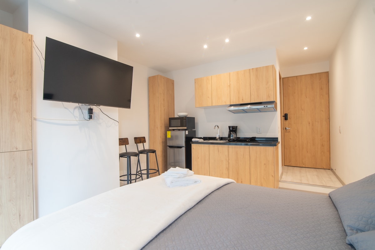 Fullbúin og sjálfstæð lítil svíta. Það er mjög vel staðsett við hliðargötu og veitir þér notalegt og rólegt andrúmsloft til að gista í einni öflugustu nýlendu CDMX á undanförnum árum eins og Colonia Roma sem er full af galleríum, hönnunarverslunum og galleríum. Baðherbergið er sér og eldhúsið hefur allt sem þú þarft til að útbúa sameiginlegan mat.