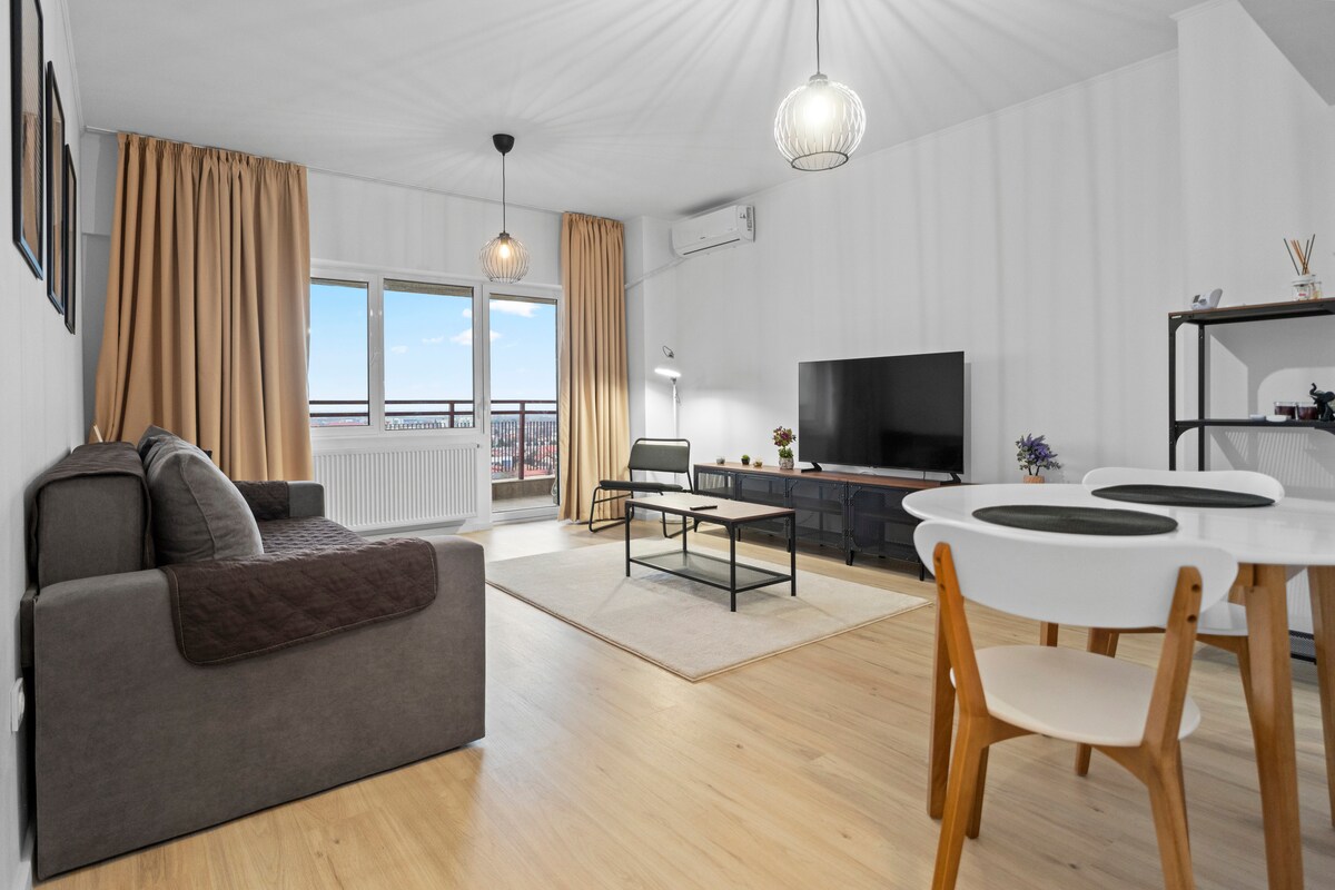 Comfortable and modern apartment with stunning view from the balcony, located close to the city center (1 minute away from Mihai Bravu subway station), with a rooftop garden and free gym for all guests. Free parking on building premises. The apartment is equipped with floor heating and all the necessary amenities: - Laundry room - HD Smart TV (Netflix included) - Coffee machine - Clothing Iron - Hangers - Clean bed sheets - Towels - Cleaning products - Cutlery - Plates - Glasses - Pans & pots