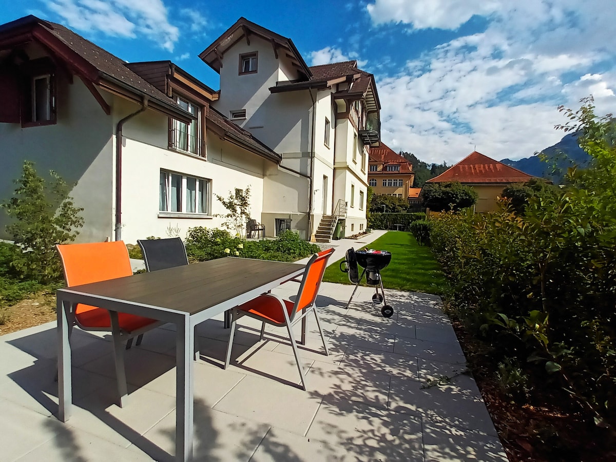 Sjálfstæð, 2,5 herbergja íbúð (1 king-rúm, 1 stórt hjónarúm og 2 einbreið rúm), nútímaleg uppgerð í gömlum svissneskum skála með eigin aðgangsdyrum og setusvæði í garði undir gömlu fallegu tré. Staðsett í innan við 5 mín. göngufjarlægð frá verslunum og 10 mín. frá miðbæ Interlaken. Íbúðin er innréttuð og innréttuð í lúxus og þægilegum stíl.
