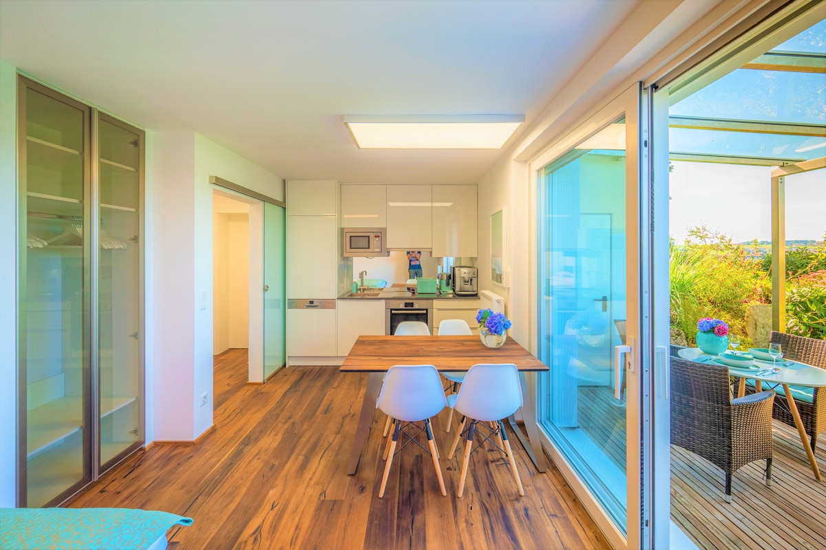 Njóttu fallega umhverfisins á þessum rómantíska stað í náttúrunni við borgarmörk Salzburg. Byggð árið 2023, 75 fm risíbúð á lífræna bóndabænum "Edtgut"! Þægilegt og nútímalegt, nýbyggt! Einka sólríka þakverönd með 2 sólbekkjum og borðstofuborði fyrir 4 manns! Baðherbergi með sturtu, frístandandi baðker, stór eldhúseyja fullbúin, 2,40 m king size rúm og 1,80 m svefnsófi eru í opinni stofu! Salernið og geymslan eru sérherbergi!