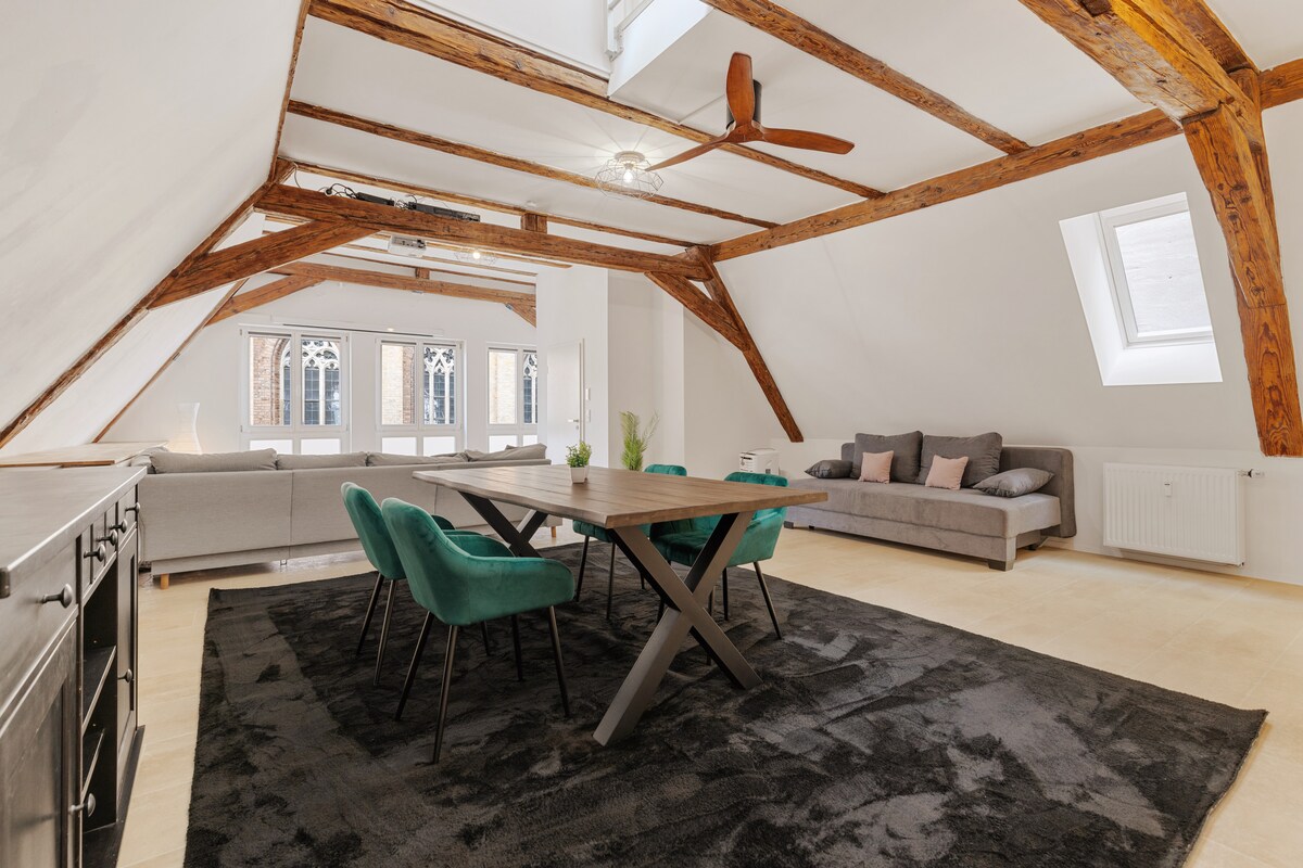 Verið velkomin í ÞÆGILEGAR íbúðir og þessa rúmgóðu risíbúð í gamla miðbænum í Ingolstadt sem býður þér allt fyrir frábæra dvöl: → þægileg box með tvöföldum rúmum → Frábær miðsvæðis í miðborginni → Neðanjarðarbílastæði (2,50 m breið, 5 m löng, 1,90 m há) → Myndvarpi með snjallsjónvarpi og NETFLIX → NESPRESSO Coffee→ með útsýni yfir St. Matthäus kirkjuna → Eldhús → Þvottavél og þurrkari → göngufjarlægð frá strætóstöð, veitingastöðum og verslunum.