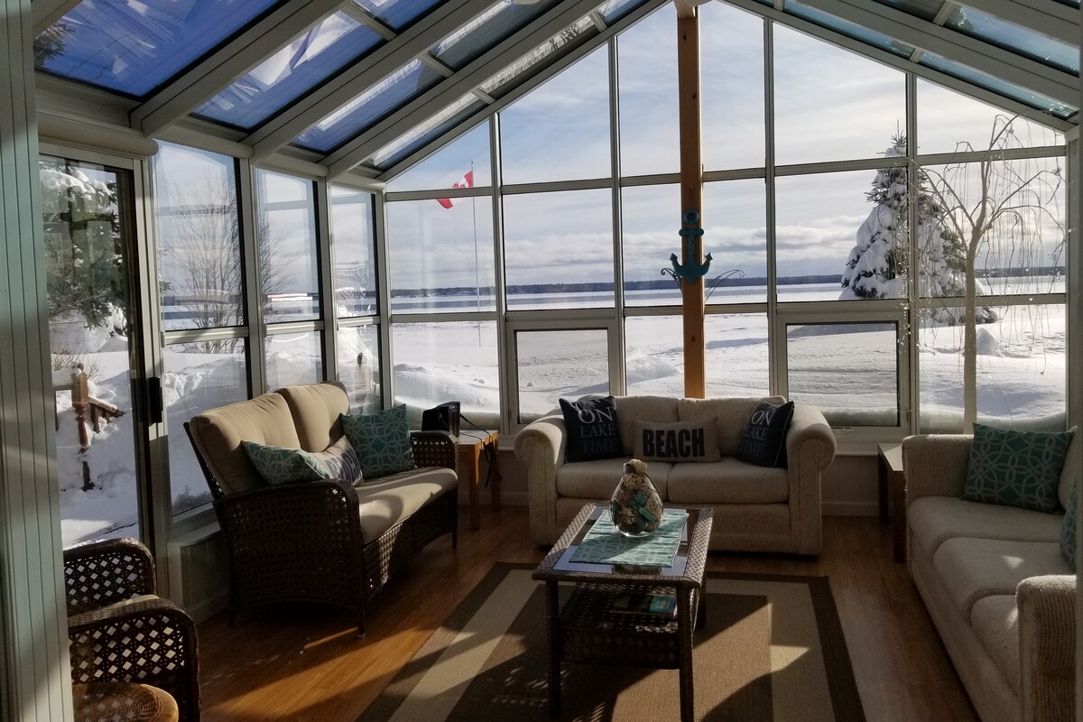 HAUSTKRÁIN við vatnið er fjögurra hæða, 2 svefnherbergi, indæll strandbústaður við fallega Superior-vatn, kanadískan megin við landamærin. Sandströnd þar sem hægt er að skemmta sér við sjávarsíðuna. Útigrill með viði. Pallur framan og aftan við bústaðinn. Útigrill. Fimm mínútna akstur frá Sault, ON flugvelli, 20 mínútna akstur í bæinn, matvöruverslanir og verslanir. Mjög rólegt hverfi íbúa í fullu starfi og árstíðabundnir bústaðir. Njóttu flutningaskipa, gönguferða, hjólreiða Dagleg (3 daga mín) leiga, sumar, haust, vetur og vorverð í boði.