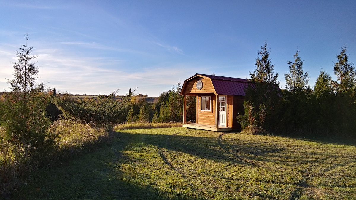 The cabin is located on a private wooded hill top with great sunrise and sunset views. Þú getur keyrt upp og lagt við hliðina á kofanum. The cabin is very basic one room structure with a queen size bed, tables and chairs. Baðherbergi, sturta, loftíbúð með húsgögnum, kaffi, rafmagnstenglar og eldhúsrými eru í stuttri göngufjarlægð inni í sameiginlegu rými Events Barn. Ekkert rafmagn er í klefanum sjálfum en hann er með rafhlöðuknúin ljós. Engin loftræsting.