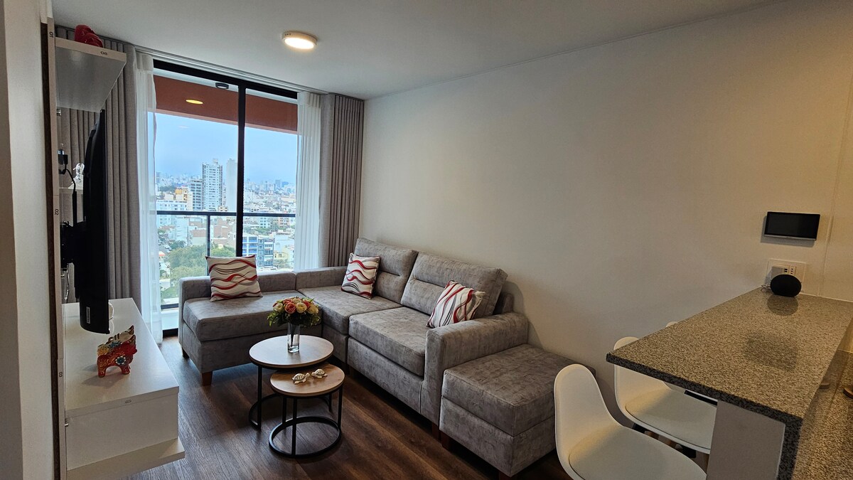 Njóttu þæginda fullbúinnar og nútímalegrar íbúðar sem staðsett er nokkrum húsaröðum frá verslunarsvæðinu Magdalena del Mar (5 mín.), mjög nálægt Plaza San Miguel verslunarmiðstöðinni (10 mín.), Arena 1 og Costa 21 (6 mín. á bíl / 15 mín. göngufjarlægð). Auk þess er stutt að komast að aðalgötunum eins og Brasil, Javier Prado og La Marina og það er aðeins í 30 mínútna fjarlægð frá Jorge Chavez-flugvelli og því tilvalinn valkostur fyrir bæði frí og viðskiptaferðir.
