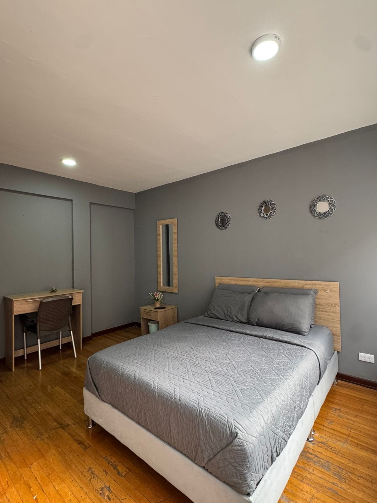 Este acogedor apartaestudio es de uso exclusivo, independiente y privado consta de una habitación amplia, con una cama doble, TV, clóset y mesa de escritorio, baño con agua caliente y una cocineta con nevera la cual tiene lo necesario para cocinar como ollas, loza, cubiertos y otros adicionales. El apartaestudio se encuentra ubicado en la parte de atras de la casa principal, por lo que la entrada es compartida entre ambos. El apartaestudio tiene una buena iluminación, es muy limpio y acogedor