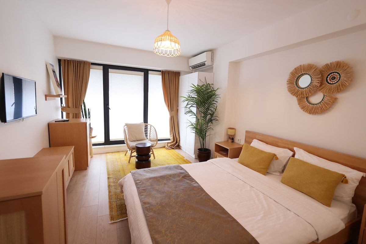Húsið okkar er í Arnavutköy. Ef þú vilt frið í borginni ertu á réttum stað, í 5 mínútna göngufjarlægð frá ströndinni og miðbænum, nálægt öllum vinsælum stöðum. Barir, kaffitería, veitingastaðir o.s.frv. 15 mínútur að ganga að barninu. Fullkomin íbúð sem hentar pörum. Staður með einstakri náttúru og landslagi þar sem þú getur vaknað með fuglahljóð, fjarri hornum umferðarinnar.80 m2.1 svefnherbergi, 1 stofa, eldhús og baðherbergi. Og það er einkaverönd með frábæru sjávarútsýni.