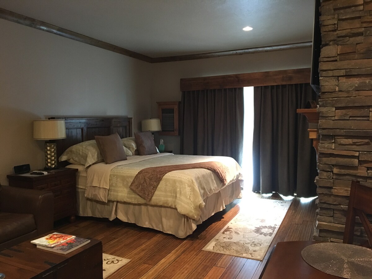 Vaulted upper level studio 1.5 miles to Ski Resort and Main St (approx 5 mins away) 360 sq ft. ÓKEYPIS strætó tekur þig til úrræði/versla. 60" snjallsjónvarp, viðargólf, gasarinn, LÍTIÐ eldhús, king-rúm (fyrir 2) og svefnsófi í fullri stærð með memory foam dýnu (fyrir 1). Heitur pottur opinn allt árið. Sundlaug opin yfir sumarmánuðina. Veitingastaðir í göngufæri. Þú þarft að fara upp eina tröppu til að komast inn. Ég vil að stúdíóið mitt líði eins og heima hjá þér að heiman!