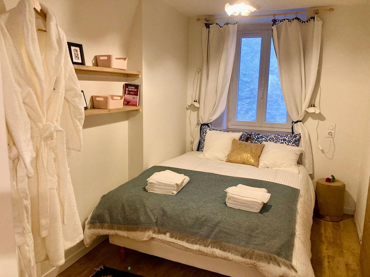 Komdu og settu ferðatöskurnar þínar í þessa fallegu, heillandi íbúð sem er vel staðsett í miðbæ Arbois, höfuðborgar vína Jura. Þessi hýsing er með vandaðri skreytingu og býður upp á einstakt, mjúkt og hlýlegt andrúmsloft sem er á milli þess að vera ósvikin og nútímaleg. 🌸 Smá himnaríki í borginni: Sjaldgæft í miðborginni, þú munt njóta fallegs græns og notalegs hússgarðs, fullkomins til að njóta kaffis í sólinni, kvöldverðar utandyra eða glers af Arbois víni í friði.