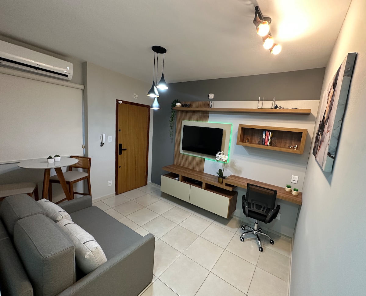 O espaço possui airfrayer, microondas, liquidificador, churrasqueira eletrica, misteira, fogão de indução ,forno, bebedouro soft, shampoo, condicionador, sabonete, roupas de cama, toalhas, geladeira, cama box baú, ar condicionado e tv nos 2 quartos, smartv de 50", wifi , guarda roupa, mesa com cadeiras, sala e cozinha.