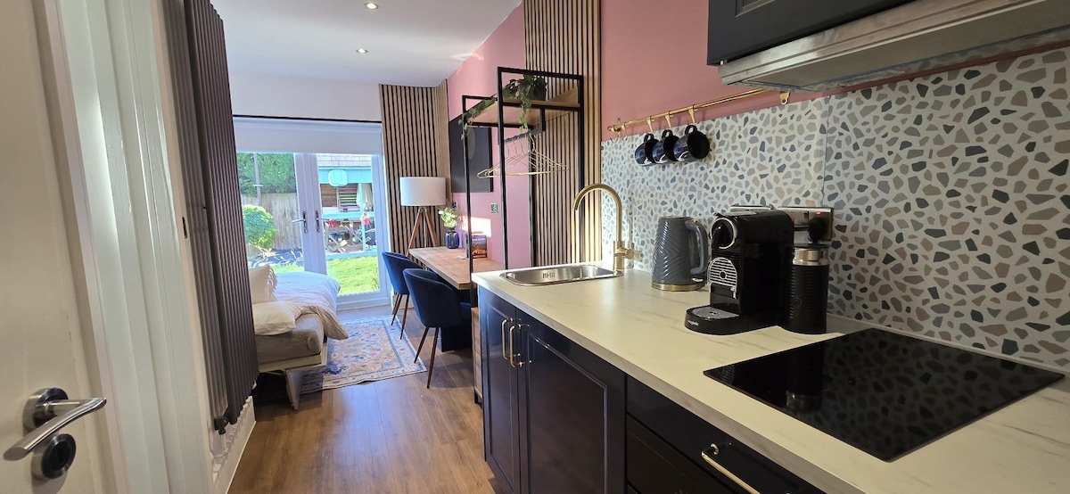 Komdu þér fyrir í Cowbridge Studio eftir að hafa skoðað hinn fallega Vale of Glamorgan. Stúdíóið er sjálfstætt viðbygging (með sérinngangi) staðsett rétt við Cowbridge High Street þar sem þú getur fundið úrval af kaffihúsum, veitingastöðum og boutique-verslunum. Stúdíóið er hannað með gesti í huga til að fela í sér allan nútímalegan lúxus eins og Nespresso-vél fyrir morgunbruggið þitt, notalegt rúm, snjallsjónvarp, sturtuhaus með regnskógum, hvítum vönduðum handklæðum, handklæðaofni og nauðsynjum á baðherbergi.