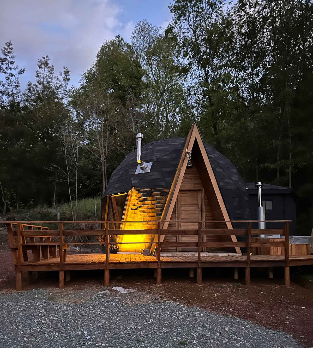 Upplifðu lúxusútileguna í miðjum frumbyggjaskóginum. Hvelfishús 6 metrar í þvermál, búin öllu sem þarf til að eiga notalega dvöl. Þar er heitur pottur fyrir fjóra gesti. Staðsett á 44 kílómetra, á leiðinni til Nevados de Chillán. Við hlökkum til að sjá þig!