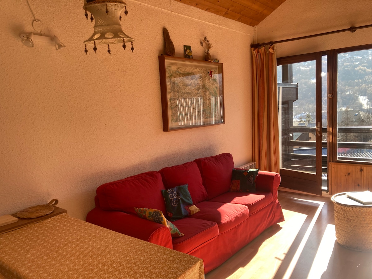 Lítil notaleg íbúð fyrir 2 sem rúmar 4 manns í dæmigerðu þorpshúsi, í miðjunni, nálægt öllum þægindum, veitingastaðabar á jarðhæð, skutlum og gönguferðum og gönguskíðum. Stiginn er brattur til að komast að íbúðinni á 2. hæð (1 hæð til að klifra upp). Síðan ferðu í gegnum svefnherbergið með hjónarúmi til að komast inn í stofuna/eldhúsið. Í svefnherberginu er sturta, vaskur og salerni aðskilið með gardínubrekka.