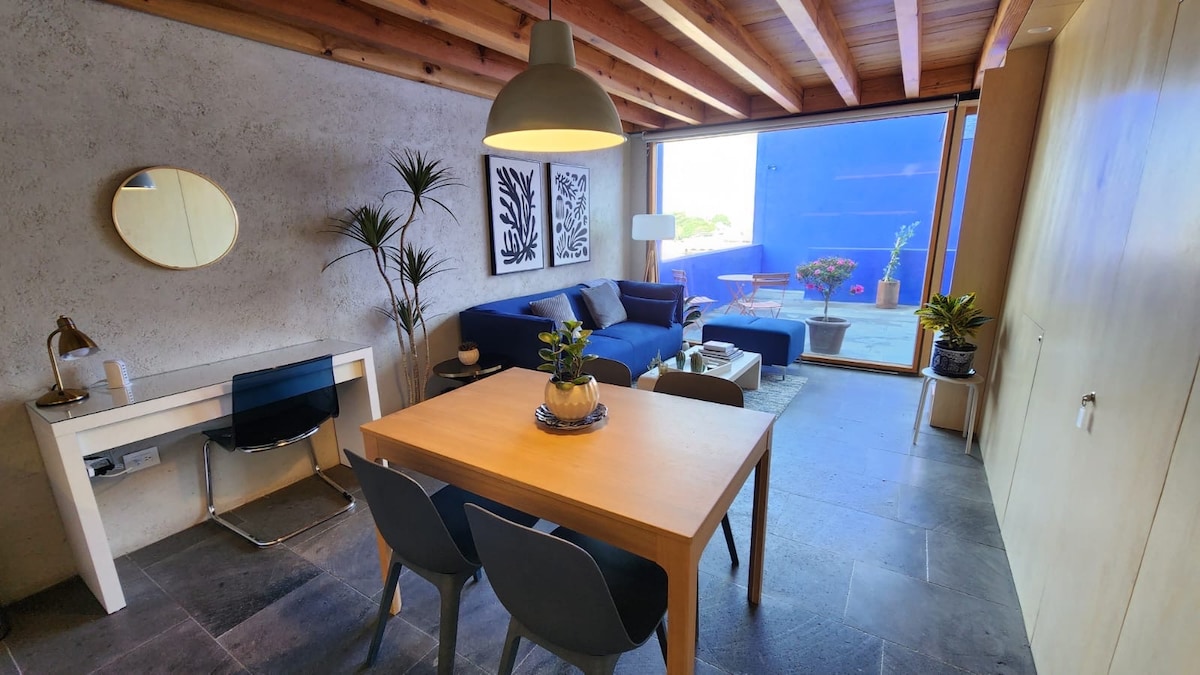 Verið velkomin í Casa Martina, glæsilega loftíbúð í uppgerðu og arkitektúrþekktu Casona í einstökum sögumiðstöð Puebla. Þetta þriggja hæða rými býður upp á allt sem þú þarft fyrir eftirminnilega dvöl: King-rúm með 60’ sjónvarpi + streymi, sjálfvirkar rúllugardínur, loftræstingu, skrifborð, fullbúið eldhús með Nespresso, þvottahús og fullbúið baðherbergi með tvöföldum vöskum. Njóttu einkaþaksverandar með 360° útsýni yfir borgina og eldfjöllin. Gated building with free parking for a sedan/SUV car included.