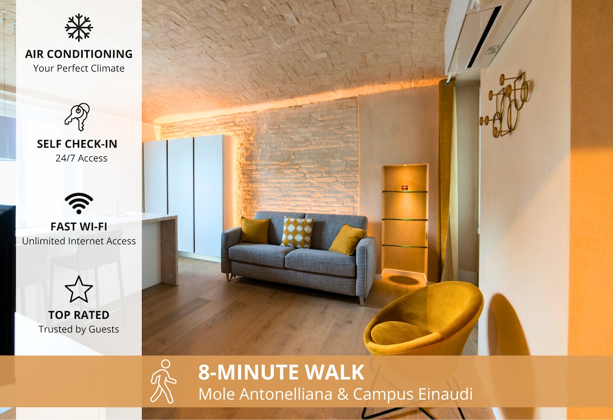 Glæsileg og miðsvæðis íbúð með útsýni yfir Mole, fullkomin fyrir þá sem vilja heimsækja borgina og slaka á í tilteknu frumskógarlegu andrúmslofti. Hannað og innréttað fyrir ferðamenn frá öllum heimshornum, tilvalið fyrir snjalla vinnu þökk sé þægilegri vinnustöð og háhraða ljósleiðaraneti. Íbúðin er staðsett steinsnar frá helstu stöðum borgarinnar, alls konar verslunum, börum og veitingastöðum. Vel tengdur við stöðina og flugvöllinn með sporvagni og rútu.