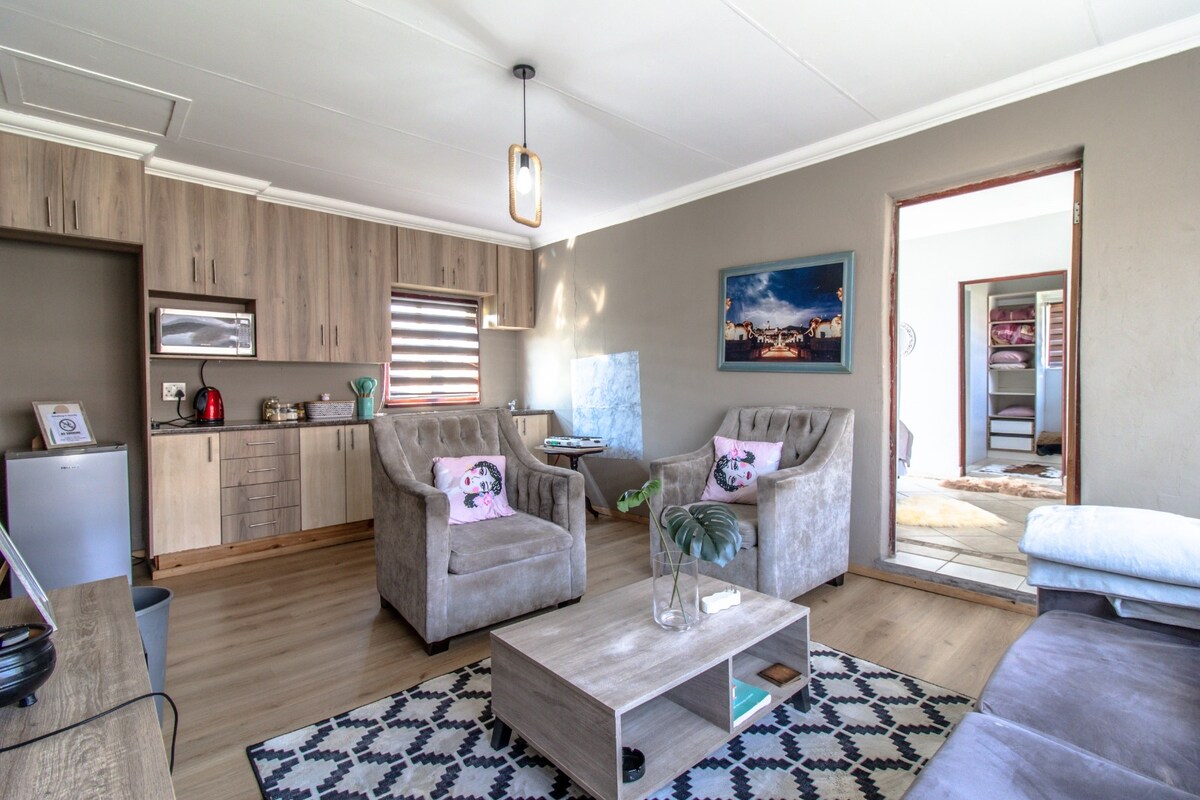 Þessi bústaður er 1 rúm og 1 baðherbergi með setustofu og eldhúskrók. Það er með þakviftu, þráðlaust net, vopnuð viðbrögð, sjónvarp með Android-kassa og eigin inngang og bílastæði. Þar er full afnot af sameiginlegri sundlaug, braai-svæðum og þvottahúsi [hægt að raða straujárni] Það er með eigin vatni og gaseldavél/ofni. NÚ Á SÓLARORKU FYRIR ÓÞÆGINDI Í ÁLAGI