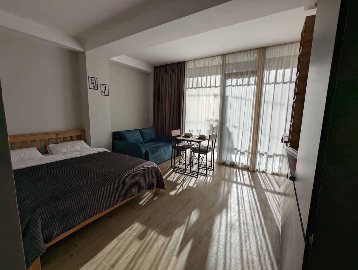 Come and relax in this calm, stylish space at the famous ski resort Bakuriani. The newly renovated studio offers view of the pine forest and mountains and includes a bedroom with a queen bed and sleeping sofa, a kitchen with tableware, refrigerator and a microwave, bathroom and balcony. There are plenty outdoor activities like skiing and hiking. One of the best skiing routes Didvelli - in just 300 meters. A pool and sauna (separately charged) are available at the residential complex Orbi Palace
