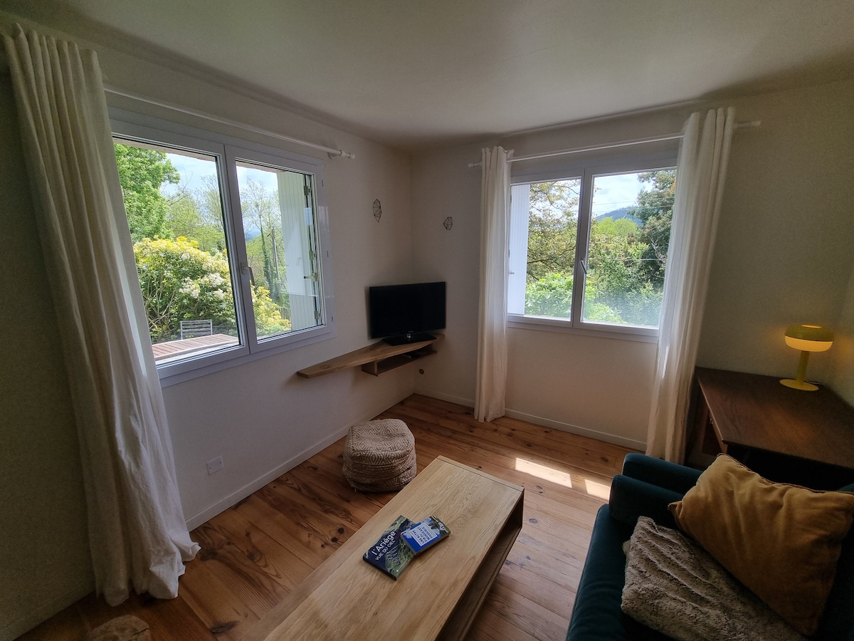 Slakaðu á og endurhladdu á þessu rólega og stílhreina heimili. Þessi skáli er umkringdur trjám og útsýni yfir Pýreneafjöllin og býður upp á alvöru frí. Veröndin gerir þér kleift að njóta útsýnisins að fullu og það er ekki óalgengt að geta fylgst með dádýrum eða öðrum villtum dýrum. Ljósmyndaunnendur, þér verður boðið upp á þig. Brottför frá göngu- og fjallahjólaleiðum beint frá skálanum. Eigendurnir búa í húsi sem er ekki samliggjandi en það er staðsett á sömu lóð.