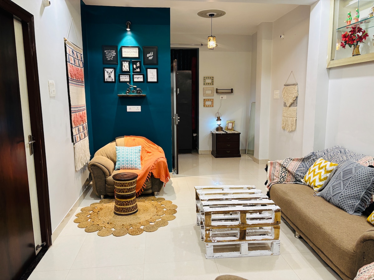 Our house is located in the heart of the city in a quiet, residential gated society. It is a clean, well-ventilated space with nice daylight in every room. We've left no stone unturned to make sure you don't miss your home when you're staying with us. You'll be able to enjoy: -A fully functional kitchen with all the essentials well-stocked. -An independent terrace & two balconies. -Parking - Two bedrooms and two modern washrooms