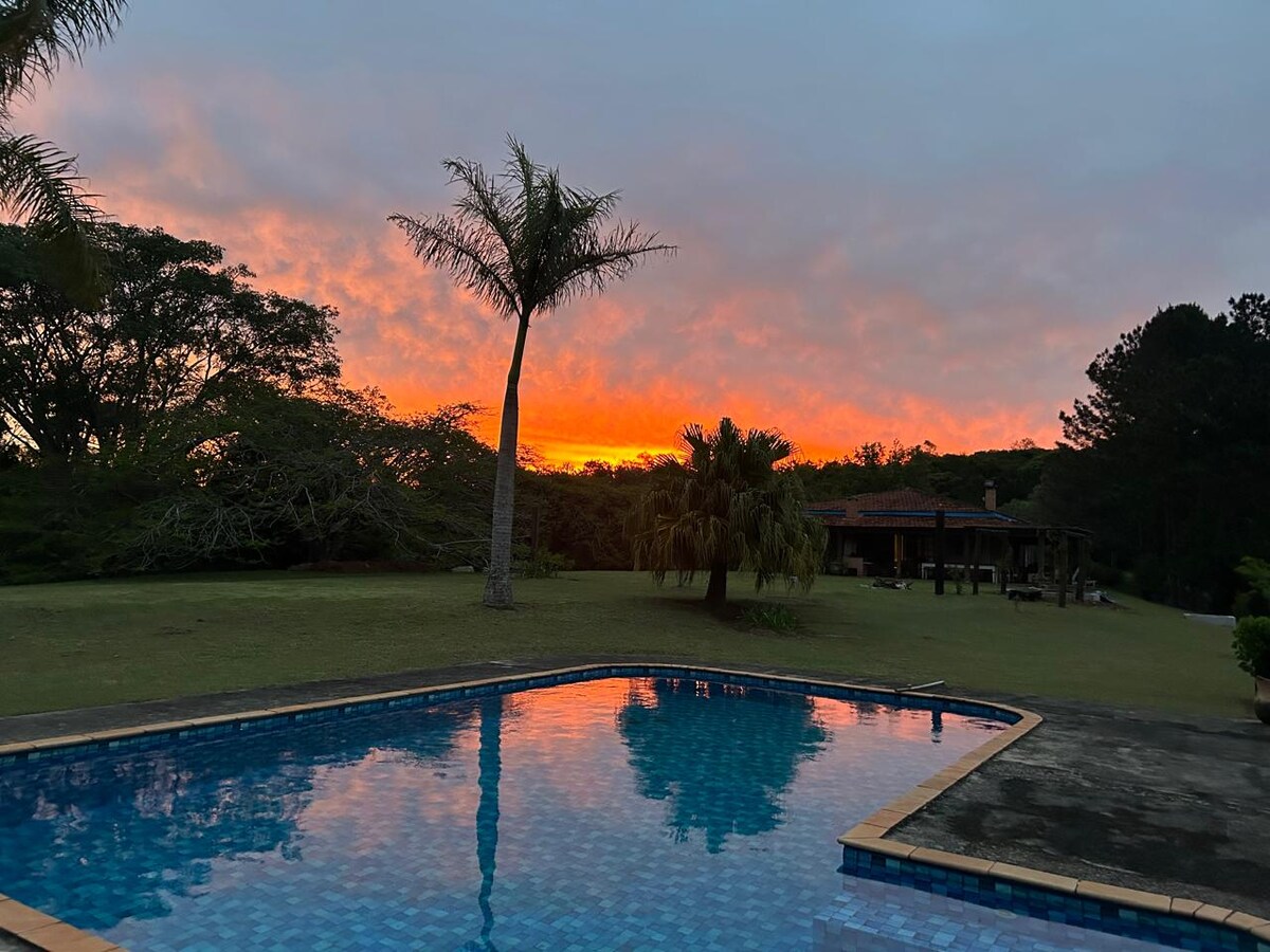 Atibaia svæðið, sem Jarinu er hluti af, er flokkað af UNESCO sem er með annað besta loftslag í heimi. Rómantíski skálinn (70 m2) er mjög heillandi, rólegur og notalegur! Lokað fjölskylduíbúð með útsýni yfir fjallið umkringd miklu grænu og með nokkrum tómstundavalkostum: sundlaug, nuddpottur (upphitaður), vatn ( einka), ytri og innri arinn, grill (einka), pizzaofn (sameiginlegur), leikherbergi, fótboltavöllur, svalir, sjónvarp, himinn og ljósleiðara þráðlaust net).