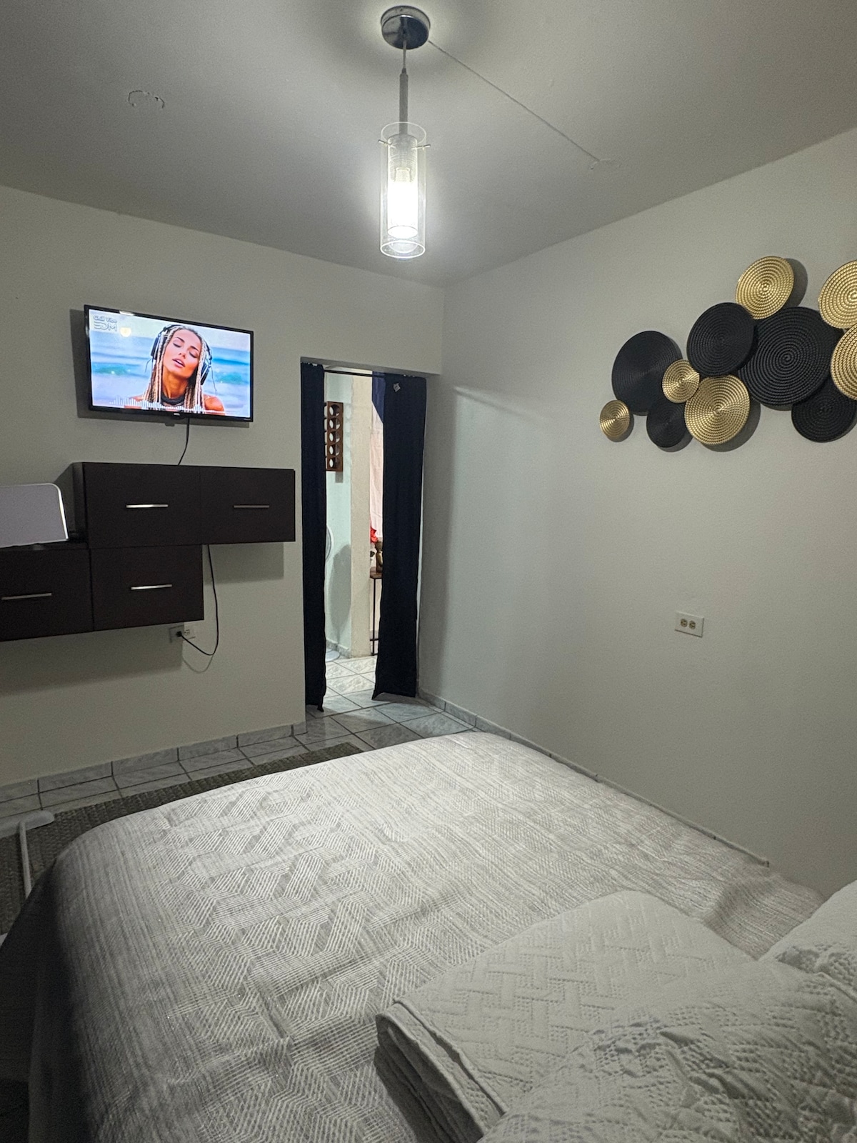 Í íbúðinni er eitt stórt svefnherbergi með queen-size rúmi og kojum. Fullkomið fyrir börn eða pör. Hún er með eitt fullbúið baðherbergi inni í íbúðinni og salerni á veröndinni, lítið stofusvæði, borðstofusvæði og lítið eldhús. Staðsett aðeins 5 mínútum frá Puerto Nuevo-strönd. Þægindin fela meðal annars í sér loftræstingu, þráðlaust net og bílastæði fyrir tvo bíla. Nálægt Wilma Vázquez sjúkrahúsinu, apótekum, matvöruverslunum og veitingastöðum.