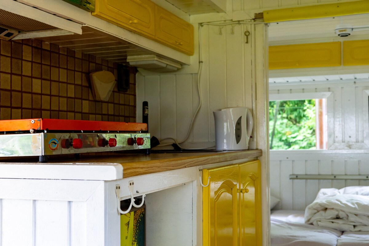Retro hjólhýsið með verönd býður upp á notalega og þægilega dvöl. Njóttu útsýnisins yfir skógargarðinn og útieldhúsið. Endurnýjaða innréttingin er með setu- og vinnuaðstöðu með innrauðri upphitun. Upphitað hreinlætissvæði er í nágrenninu. Gestir geta einnig notað sameiginlega garðherbergið og veröndina við tjörnina sem er fullkominn staður til að slaka á og njóta náttúrunnar.