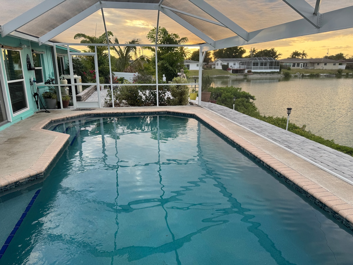 Superhost property: April weeks now available with a 5 night min. Welcome to Paradise! Private and loaded with all you need to relax. This spectacular lake front home is minutes to the beach and Venice. Enjoy our new screened lanai with panoramic view. Home is set back w/gardens, heated pool , lakeside patio & now, two king beds. A slice of the Tropics is found here, hospitality at its best! Home best suited for mature adults and their children ages 16 and up. Come home where paradise awaits.