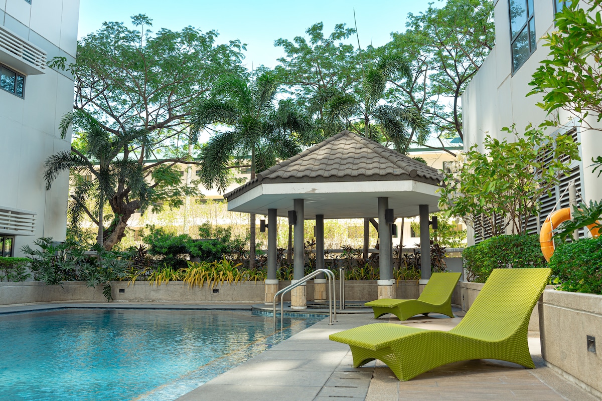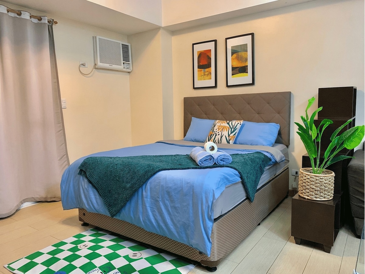 Enjoy a stylish staycation in our luxurious studio unit. Our fully furnished unit boasts a sleek design and a comfortable queen size bed for a good night's sleep. Stay connected with blazing-fast 200 mbps internet and enjoy a tranquil greenery view. Book now for a hassle-free stay and unforgettable memories!