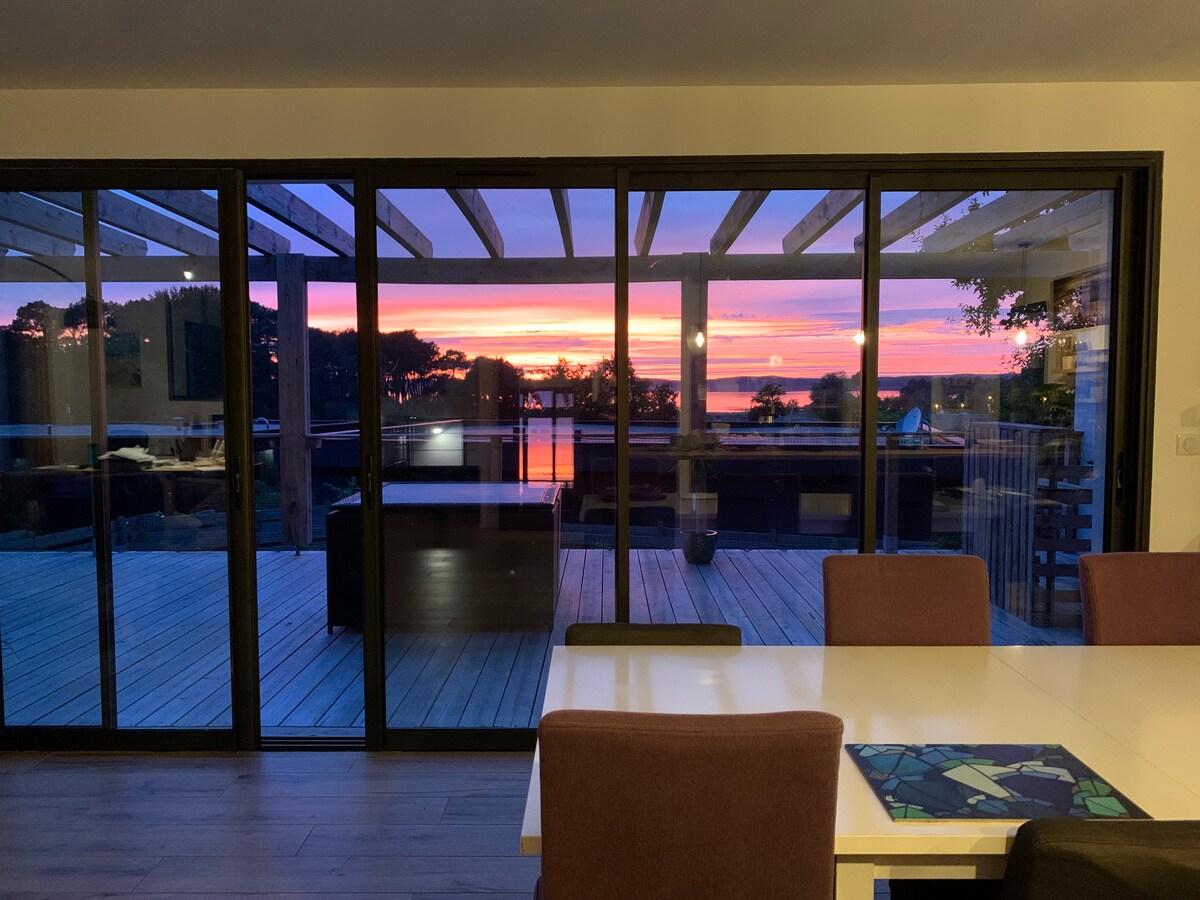A Hourtin-plage, à quelques pas de l'océan et à proximité des pistes cyclables, des commerces et restaurants de cette petite station balnéaire réputée pour le surf, La villa Bikini, charmante maison bois entièrement rénovée et décorée avec goût vous enchantera :) Nos voyageurs pourront bénéficier gratuitement d'un accès au tout nouveau parc aquatique de 9000 m2, Aqua Pirate, lagon, toboggans, bain à remous.. situé au sein du camping 5* à 150 m de la maison. (Ouvert mi/fin Mai à mi-Septembre).