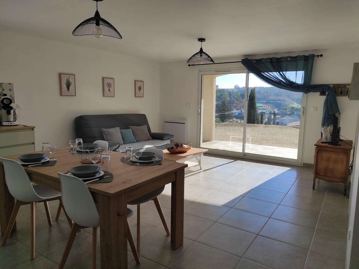 Þessi eign er hljóðlát og er með útsýni yfir þorpið. Frá veröndinni er útsýni yfir sundlaugina og náttúruna. Þú ert algjörlega sjálfstæð/ur með einkaverönd með plancha. Þú sefur í frábærum rúmfötum fyrir hótelgæðin 3*-4*. Rúmföt 1 hjónarúm + 1 einbreitt rúm eða 3 stakir listar. Eldhúsið er fullbúið með ofni, örbylgjuofni og uppþvottavél. Baðherbergið er mjög rúmgott með sturtu. Þú verður einnig með aðgang að þvottavél.