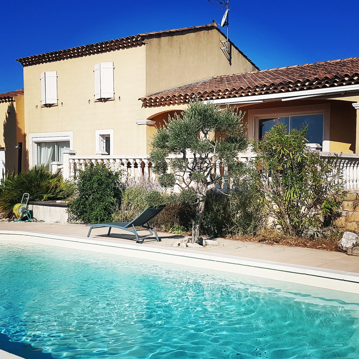 📍Villa paisible au cœur de la Provence qui permet d'offrir un séjour détente pour toute la famille. 👨👩👦 8 personnes 🛌 4 chambres : 1 lit 160cm/ 1 lit 140cm/ 1 clic-clac 140cm/ 2 lits simples 90cm (draps et serviettes fournis) 🛁 2 sdb dont une avec baignoire, 2 wc 🏖 Piscine, Terrain de boules, grande terrasse 🚘 4 emplacements voiture 🐕 Animaux de compagnie acceptés 🌍💻 Internet / WiFi / espace de travail 🏕 Portail électrique, terrain clos