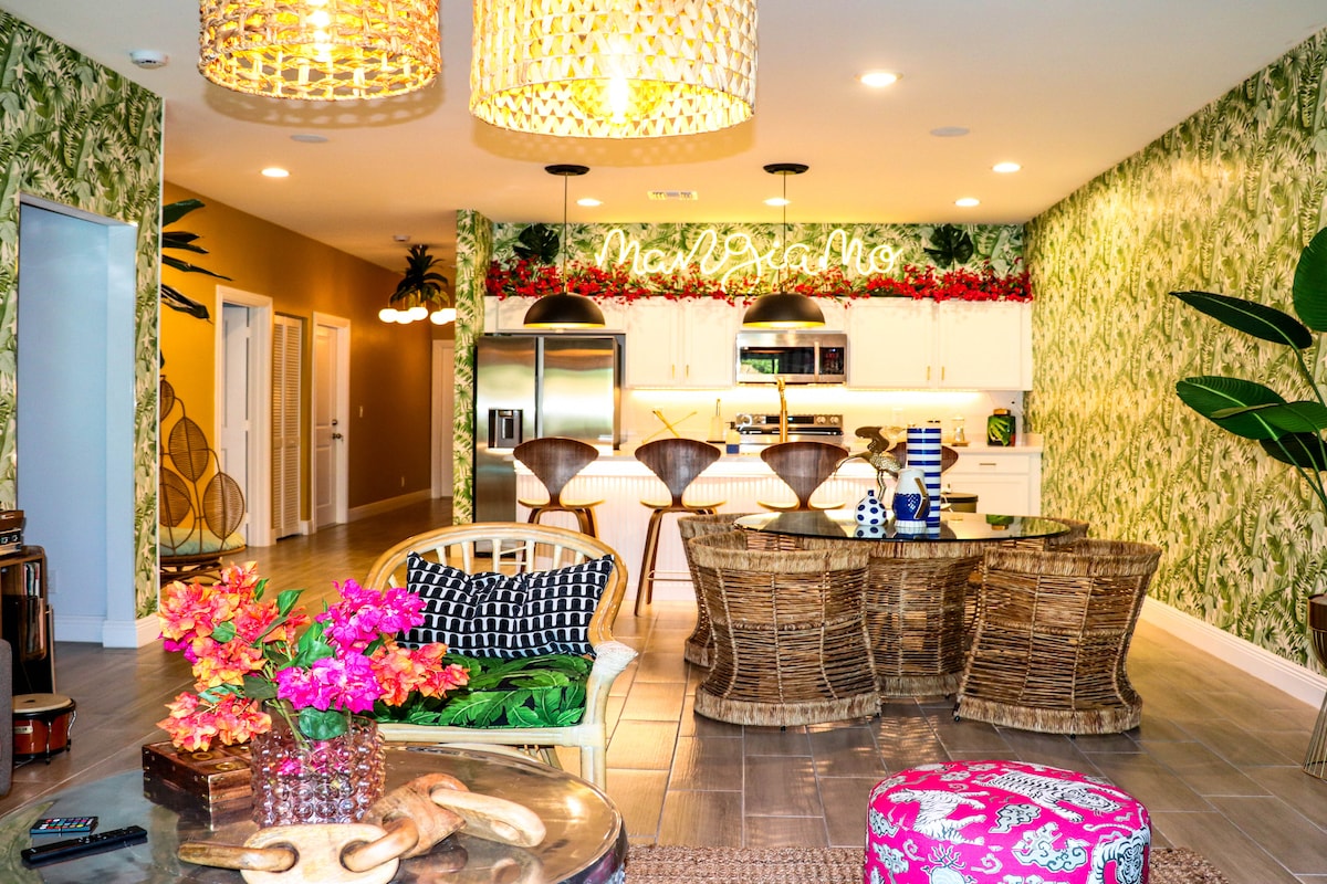 Heillandi bústaður frá 1950 í Flórída. Fjölskylduminningar bíða þínar í fágaðri og hlýlegri umgengi í þessari heillandi eign frá Flórída á sjötta áratug síðustu aldar. Aðskilið svefn- og baðsvæði fyrir ömmur og afa / foreldra. Þrjú svefnherbergi, tvö baðherbergi, 2 með queen-size rúmum, 1 með tveimur einbreiðum rúmum og svefnsófa í stofu. Svefnaðstaða fyrir 8 Mjög há, 100% bómull, þráðatalað rúmföt, fullbúið eldhús, borð og sæti utandyra bíða fjölskyldu þinnar á meðan þú skapar minningar í paradís. Sérsniðnir skápar