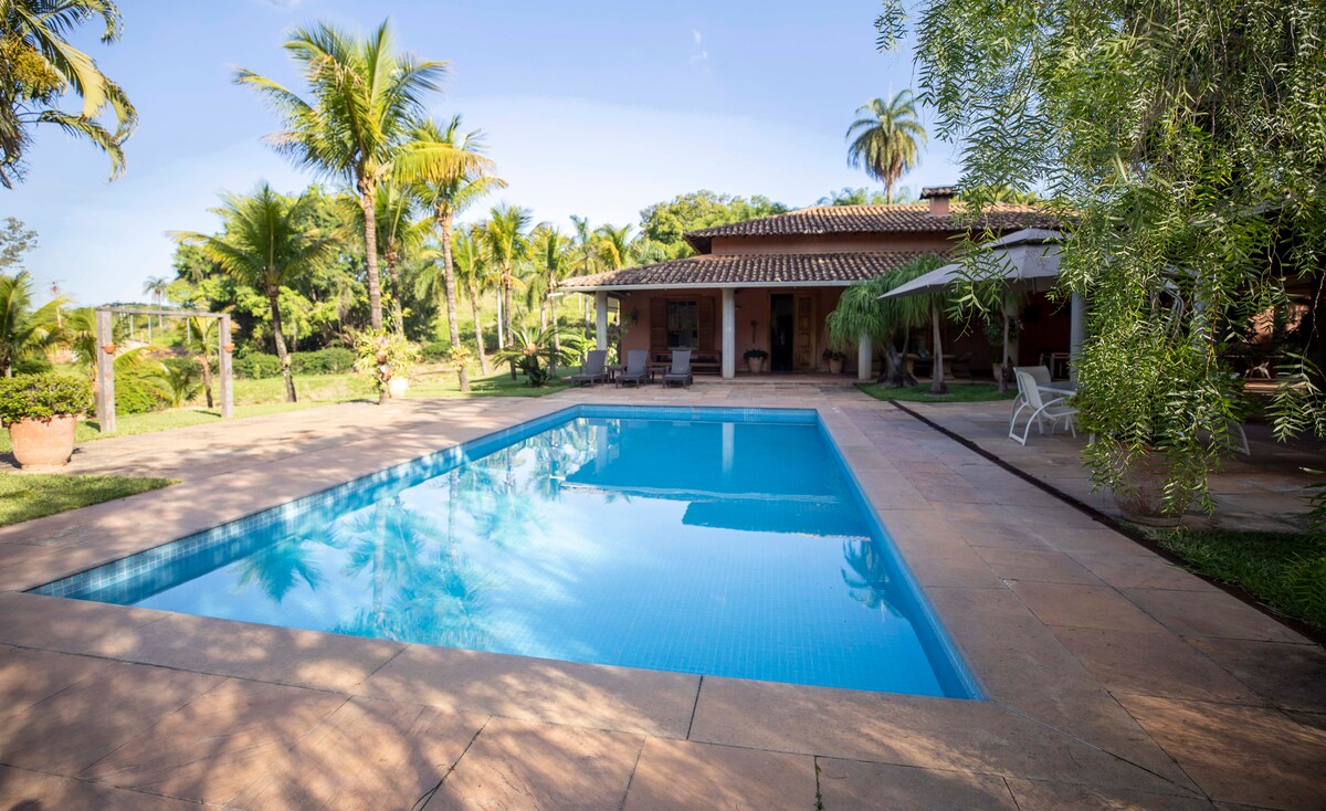 Ímyndaðu þér að vakna við fuglasöng, anda að þér hreinu lofti undir aldagömlum trjám og slaka á eða vinna á heimaskrifstofu í takt við náttúruna. Fullkominn staður fyrir pör, fjölskyldur og vini með nægu plássi í kringum sig til að leika sér með gæludýrið sitt. Sveitahús með ýmsu umhverfi og mjög grænu útisvæði, þar á meðal fyrir gæludýrið þitt. Eignin rúmar allt að 6 manns. Eignin er með bílskúr fyrir 3 bíla og er umkringd mangótrjám, pequi-trjám og miklum blómum.
