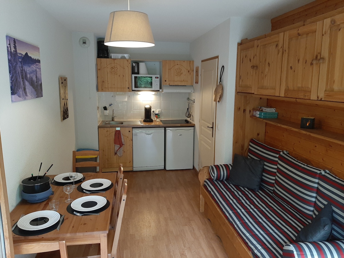 Heillandi íbúð 4 sófi. 28 m2 staðsett í skjóli í stjörnubjörtu ferðamannahúsnæði, búin með uppþvottavél, ísskáp, örbylgjuofni, eldhúshlið helluborði, rúm 160x200 svefnherbergi hlið, breytanleg 140x200 stofa hlið. Húsnæðið er með bílastæði, skíðageymslu og veitir stórkostlega þakverönd með sundlaug og nuddpotti (aðeins á háannatíma). Fjölmörg afþreying á staðnum: skíði, gönguferðir, fjallahjólreiðar, flúðasiglingar, um ferrata, svifflug, sleðahundar...