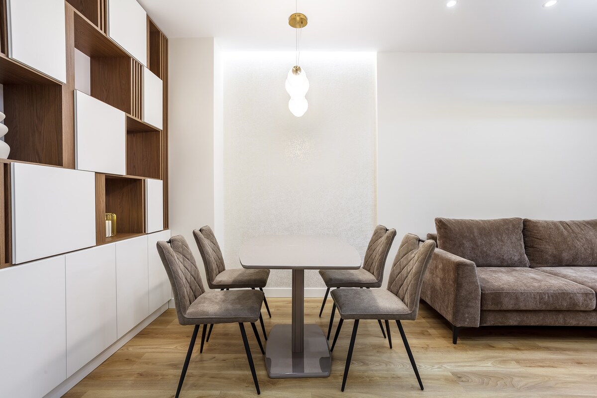 Flott íbúð í miðborginni, hönnuð í skandinavískum stíl með vintage-húsgögnum og nútímalist. Hún er staðsett í 15 mínútna göngufæri frá ströndinni og í 10 mínútna fjarlægð frá almenningsgarðinum í miðbænum og er umkringd fjölmörgum veitingastöðum og börum. Bygging frá tímanum fyrir byltinguna með notalegum Odessa-húsgarði. Í íbúðinni er sérstakt svefnherbergi með hjónarúmi og þægilegur svefnsófi í stofunni. Íbúðin er fullbúin með öllu sem þú þarft.