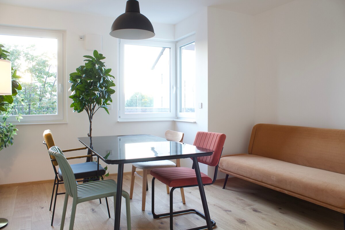 Velkomin í íbúðina mína sem ég hef hannað af ástúð og skráð opinberlega. Þú getur slakað á og unnið innan um glæsilegar og notalegar innréttingar. Þetta er tilvalinn staður fyrir fjölskyldur, vinnuferðir og pör til að kynnast fallegu Vín. Í íbúðinni eru björtar stofur, fullbúið eldhús og lítil verönd utandyra, innrauð gufubað, hröð þráðlaus nettenging, snjallsjónvarp og vinnustaður eru sjálfsögðum hlut. Miðborgin, verslunargötur, samgöngur og veitingastaðir eru í næsta nágrenni.