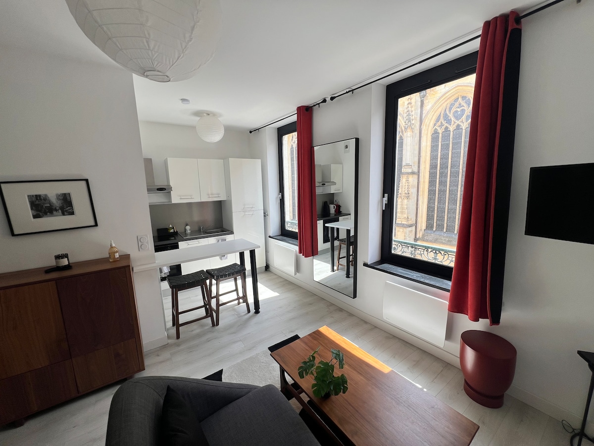 LITTLE PLAZA er lúxus íbúðahótel í hjarta gamla bæjarins! Það er með útsýni yfir mjög gott lítið torg og göngugötu. Frábær staðsetning 10 mínútur frá Grand Place og óperunni, 15 mínútna göngufjarlægð frá Lille Flandres/Europe TVG stöðinni, í hjarta verslunargata og veitingastaða. Þetta snýst allt um að ganga! LA Terrasse er staðsett á 2. og síðustu hæð og er hönnun og hlýleg íbúð sem nýtur góðs af eldhúsi/stofu sem er 18m² með svefnsófa.