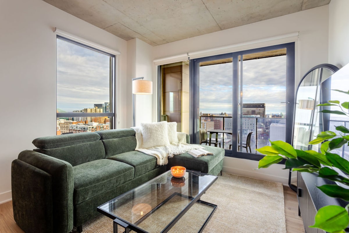 Verið velkomin í glæsilegu nútímalegu tveggja herbergja þakíbúðina okkar í hjarta miðbæjar Montreal, steinsnar frá gömlu höfninni! Þessi glæsilega þakíbúð státar af fágaðri hönnun með opnum hugmyndum, vönduðum áferðum og fullbúnu eldhúsi sem hentar fullkomlega fyrir heimilismat. Slakaðu á í lúxussvefnherbergjum með mjúkum rúmfötum og slappaðu af í glæsilegu stofunni. Upplifðu fullkomna blöndu af þægindum og spennu í borginni með vinsælum veitingastöðum, tískuverslunum og næturlífi við dyrnar!