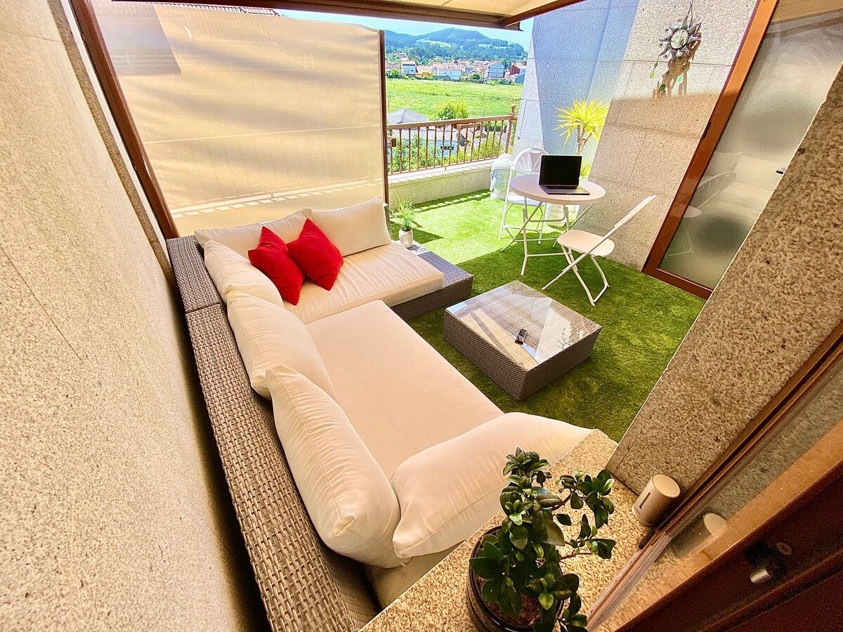 Njóttu þessarar kyrrlátu og miðlægu gistiaðstöðu, með útsýni yfir sjóinn og í minna en 5 mínútna göngufjarlægð frá O Terrón-strönd. Í íbúðinni er allt sem þú þarft, þráðlaust net, kaffivél,uppþvottavél, þvottavél/hreinsiefni, eldhúsbúnaður, rúmföt og handklæði. Bílskúrspláss í sömu byggingu. Þetta er rólegt þorp þar sem þú getur gengið um án þess að þurfa að keyra, hafa allt sem þú þarft á að halda, til dæmis bari, veitingastaði, matvöruverslanir, banka, apótek... Mjög vel tengt