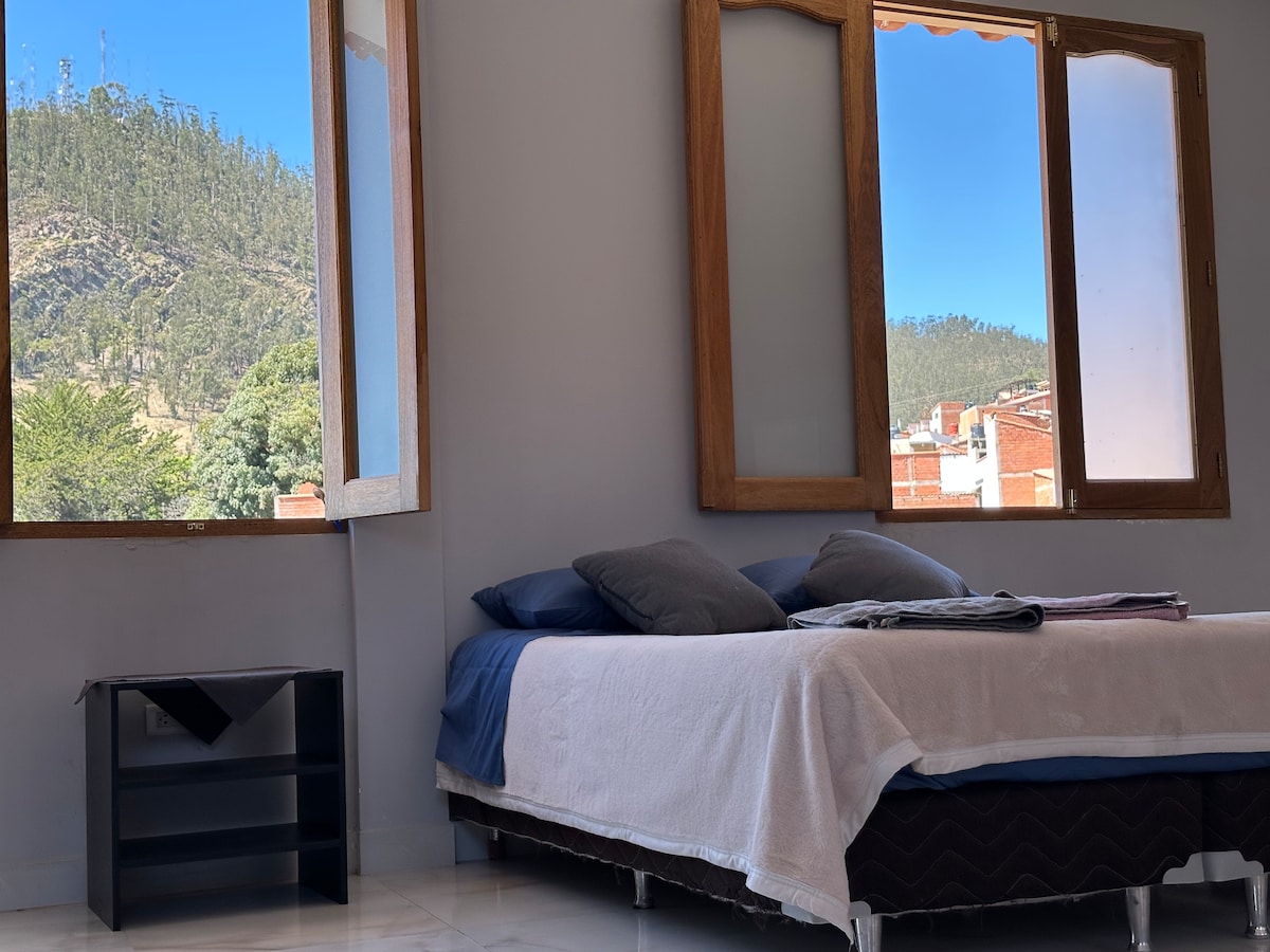 Njóttu þessarar þægilegu og björtu íbúðar sem er tilvalin til hvíldar á meðan þú skoðar Sucre. Það er staðsett á fyrstu hæð með sjálfstæðum inngangi og aðeins 4 húsaröðum frá aðaltorginu. Hér er eitt svefnherbergi, rúmgóð stofa, sérbaðherbergi og garður með verönd. Þetta er rólegur staður, fullur af dagsbirtu. Svæðið er öruggt og mjög hagnýtt: nálægt matvöruverslunum, veitingastöðum og sögulega miðbænum.