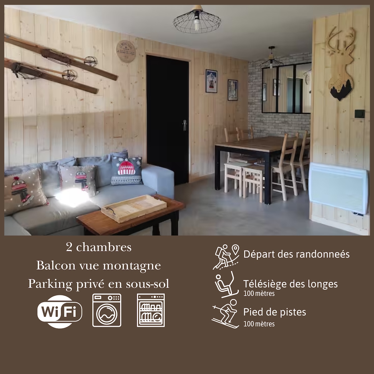 Íbúð fyrir 1 til 6 manns, í skálastíl, staðsett í Village des Longes, með beinan aðgang að stólalyftunni og gönguferðunum. Á 4. hæð með lyftu er stórkostlegt útsýni yfir fjallið! Með 32m2 svæði, þar á meðal inngangi með fataskáp, aðskildu og fullbúnu eldhúsi, stofu með smelli og tvöföldu millihæð, alrými með 2 kojum, baðherbergi með sturtu og salerni. Bílastæði neðst í húsnæðinu. 480 MB þráðlaust net. Tilvalið fyrir fjölskyldugistingu!