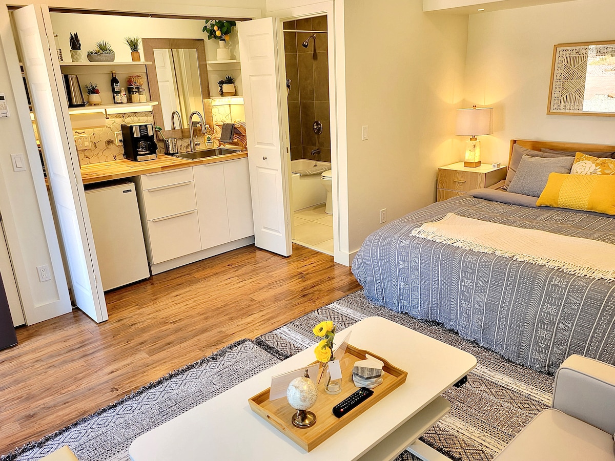 Þessi glæsilega stúdíóíbúð með king-size rúmi er staðsett við fót Cathedral Rock og býður upp á fullkomið athvarf í Sedona. Hún er með sérinngangi, eldhúskróki og baðherbergi og hönnuð fyrir ferðamenn sem vilja einfalda og þægilega gistingu nálægt náttúruauðlindum Sedona. Frá dyrum þínum getur þú rölt að Oak Creek til að fá þér hressandi sundsprett, farið í gönguferð að fallegum útsýnum yfir rauðan klett eða skoðað kristalbúðir Sedona, gallerí og orkuörstaði í nokkurra mínútna fjarlægð.