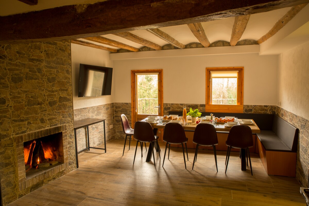 Hús í sveitinni, fullkomlega endurnýjað og uppgert, staðsett í Oix-dalnum, innan náttúruverndarsvæðisins Garrotxa. Hún er með fullbúið sjálfstætt eldhús, tvö svefnherbergi, tvö baðherbergi, stóra borðstofu og stofu og stóra útiverönd. Með sjálfstæðri loftkælingu í öllum herbergjum, þvottavél, þurrkara, ofni og örbylgjuofni. Það er með borðtennisborð, ástralskan gasgrill og viðargrill. Landareignin, 25 hektarar, er eingöngu fyrir gesti.