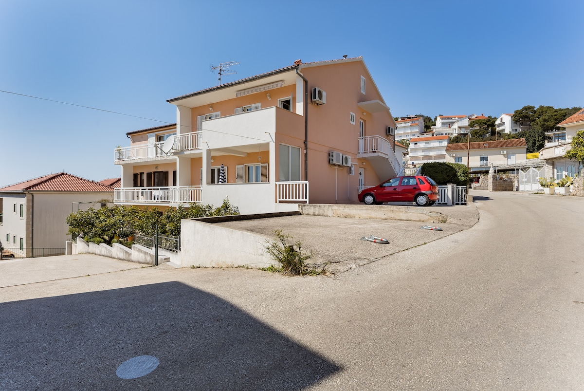 Yndisleg íbúð á 1. hæð fjölskylduhússins okkar, „Veli Bok“, sem var nýuppgerð árið 2025 og býður upp á frábært útsýni yfir hafið og Hvar-eyjaklasann. Hún er staðsett í rólegu hverfi, samt nálægt miðbænum og nógu langt í burtu frá bænum til að njóta friðsins. Húsið okkar er í 20/25 mínútna göngufjarlægð frá höfninni/aðaltorginu sem er í 1,5/2 km fjarlægð.