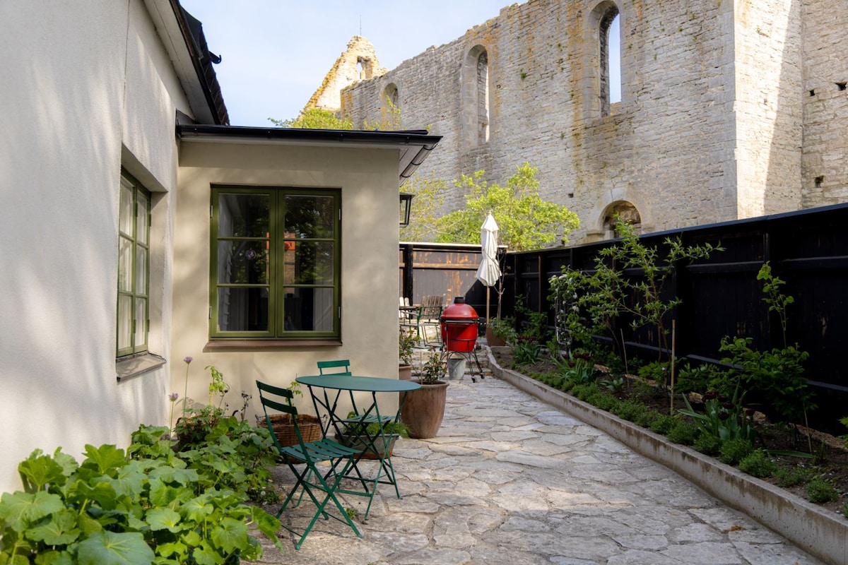 Þetta hús, sem er staðsett innan bæjarmúrs Visby frá miðöldum í brekkunum í átt að Eystrasaltinu með dásamlegu sjávarútsýni frá veröndinni uppi, var byggt árið 1760 en vandlega endurnýjað. Hér er notalegur garður með mikið af rósum, eplatrjám og útigrilli og mataraðstöðu. Gatan Skeppargatan er nálægt suðurvegg bæjarins og umferðin er róleg.