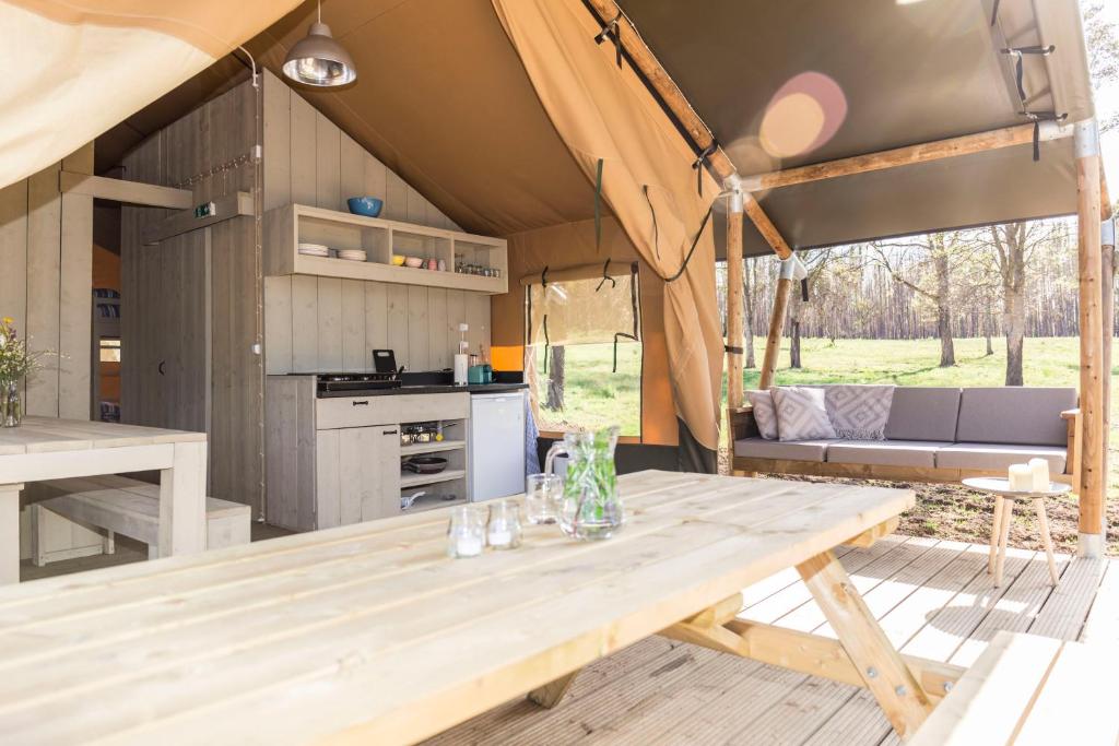 Útilega í mjög svölu, fullbúnu leigutjaldi, í miðri náttúrunni! Frá júní til september leigjum við út ýmis fullbúin fjölskyldutjöld. Öll tjöld eru staðsett á einkareknum, rúmgóðum stöðum á síðunni okkar með fallegu útsýni. Og... krakkarnir sofa í aðskildu hólfi eða... gætu verið með sitt eigið tjald! Hversu svalt er það!? Við tryggjum þér hámarksrými, frið og næði. Við getum búið til fleiri svefnpláss fyrir stærri fjölskyldur. .Zoover Award Gold 2016.